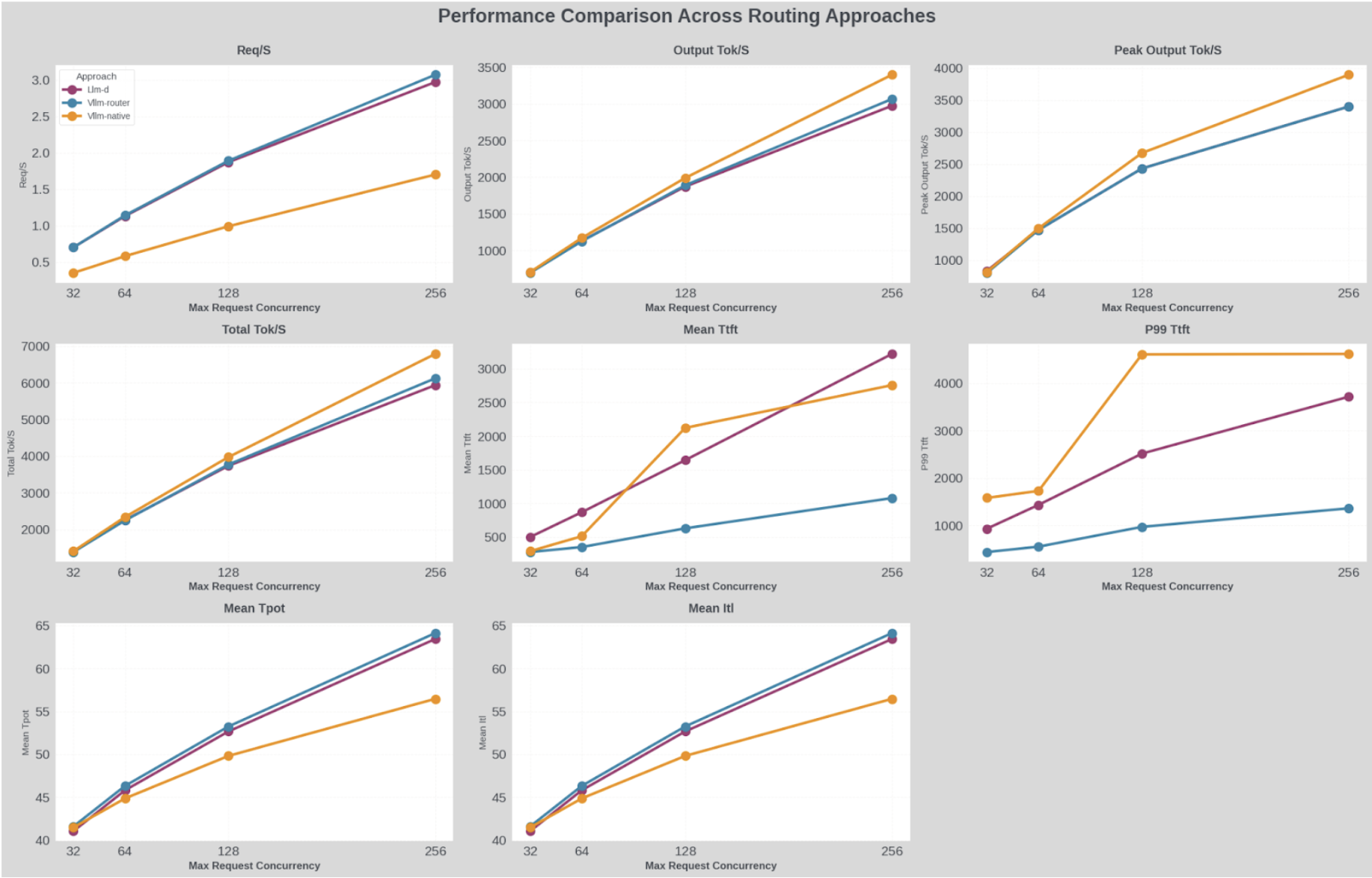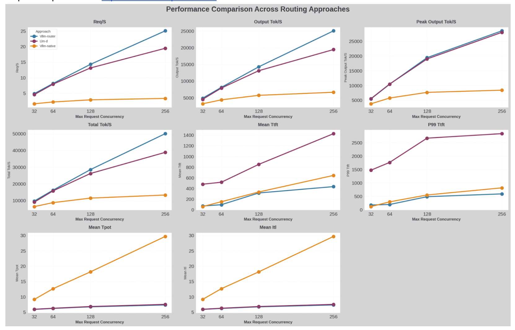 - vLLM Router (blue line) Req/S throughput is 25% higher than llm-d (purple line) and 100% higher than K8s-native load balancer (orange line).